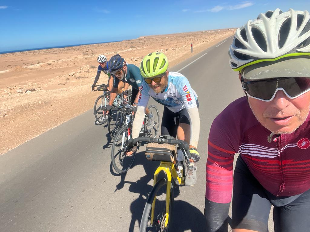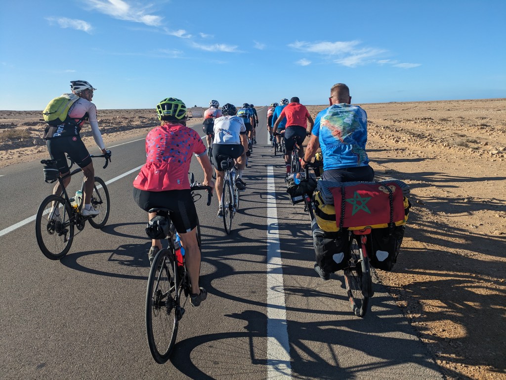 I started the day leading the pack with Kris for 20 km, gently ramping the pace from the low to the high 30s kph. The wind was nice to us and our section went easily. Later, we briefly rode with a Brit and his Moroccan friend but they were fully loaded and could not hang. The pack continued, on and on, with generally worse winds, sometimes feeling like a headwind, but also with a little climbing so we were down to the low 20s, then after an angle change, back in the low 40s.