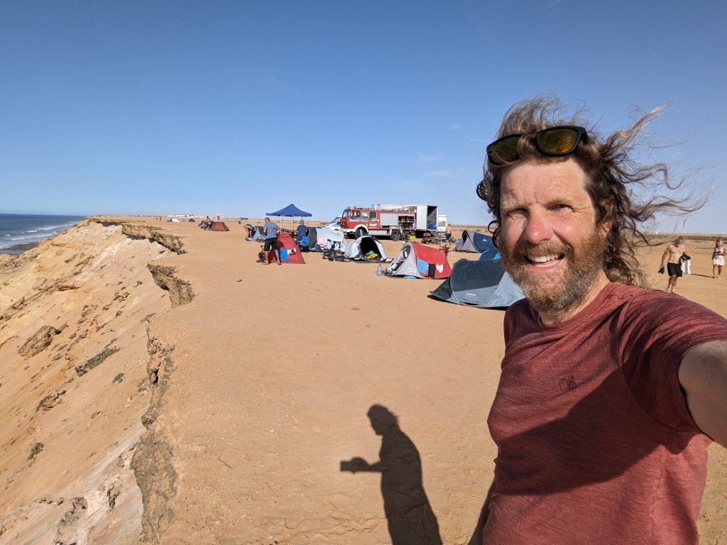 We had snacks and soup and Daniel even found another 500ml Schweppes Citron! This campsite appears to be the best bush/desert camp yet. We’re right by the cliff, the edge of Africa. The Atlantic is making beautiful music about 50m below. Yes it’s a flat desert but it’s not bad. I set up my tent in a scenic spot; all spots are scenic.