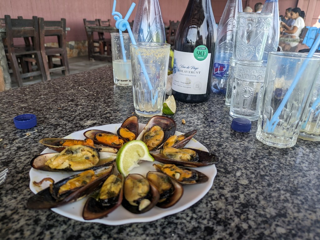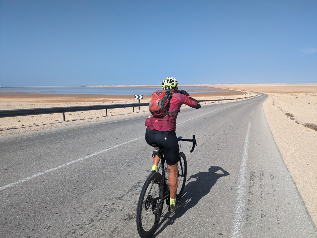 After lunch, we had another rogue plan: Daniel’s friend recommended an amazing sounding restaurant called TalhaMar. We invited Kris and rode 23 more km to the turnoff, but it was unmarked, dirt, and looked questionable. We took the second turn-off which looked the same. We offroaded it to a warehouse, went around it, twisted a few more times and finally found the place. They could use some marketing I think. Hidden away completely, it is an amazing restaurant, right on the edge of Dakhla Bay. We sat down and ordered a giant grilled fish/veggie platter, calamari, some mussels and lobsters. They didn’t have many drinks but we had a round of lemon ginger which turned out to be exactly that, no sugar. But Wytze always has us covered. He pulled a bottle of Spanish Tempranillo out of his bag! He and Daniel had just gone for a swim and Wytze sitting in his wet underwear at the table, opening a bottle of wine, with this giant grin…was great. The waiter supplied the corkscrew. The food was delicious with wine and we ate our fill. It was about $12 per person – great deal.