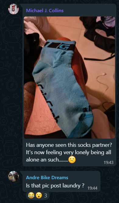 I’ve been asked about laundry – how do we do it? I usually hand-wash but that’s hard or impossible in the bush camps. Sometimes campgrounds have washing machines, but ideally, you’re in a campground and you can wash all the bike clothes you wore in the day right after a shower, and then dry them in the sun and start the next stage with everything clean. That worked all through France and Spain and parts of Morocco. Usually hotels charge a lot for laundry but you can find local places nearby. When we arrived at the hotel in Dakhla, we quickly found that the hotel would do your laundry for the amazing low price of 17 MAD (€1.50) per kg. Many people, me included, put in bags, to be ready by “noon at the latest” the next day. In reality, nothing was ready until 6pm and mine was nowhere to be found. But at 9:30, after dinner, I spied my clothes in a new bag, labelled with a different room number that someone else had paid for. Everything was there and clean and dry. Still it’s pretty risky and probably better to wash it yourself, at least your precious, destroyable and absolutely vital bike shorts. I learned, back in 2019 in the Andes, that you can actually wear cycling clothes two or even three times without washing. That’s not ideal but certainly it beats bringing six or more sets of riding clothes. I brought two sets with a backup pair of shorts that I haven’t used yet.