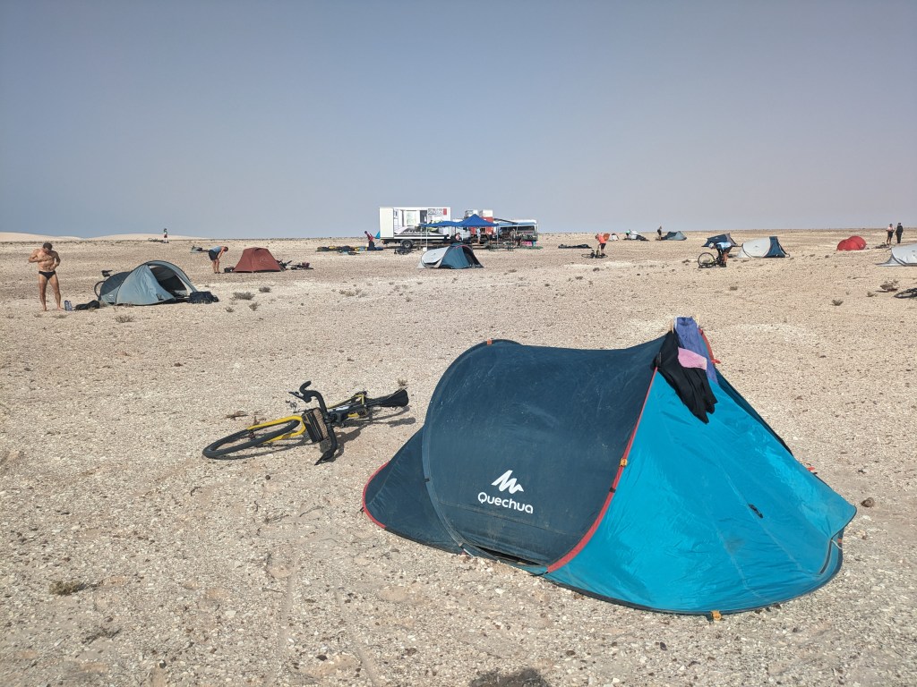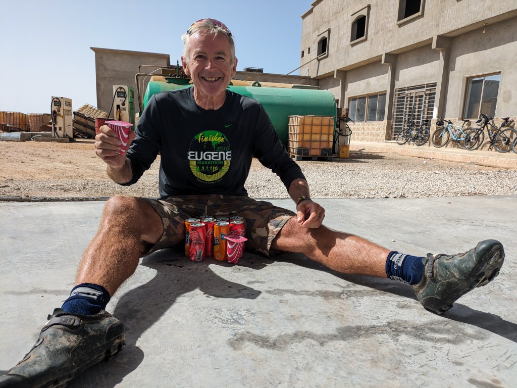 We didn’t leave until 9:30. We had to retrace 40 km from yesterday which meant riding into the wind, but it turned out to be light and no big deal. There were a couple of dirt, under-construction sections along the road. I didn’t stop until a shop/gas station at 77 km where I bought drinks for lots of riders. The owner was really nice, bringing us extra chairs and some dates, all the while smiling and saying “USA good, Biden crazy”. He seemed really happy.