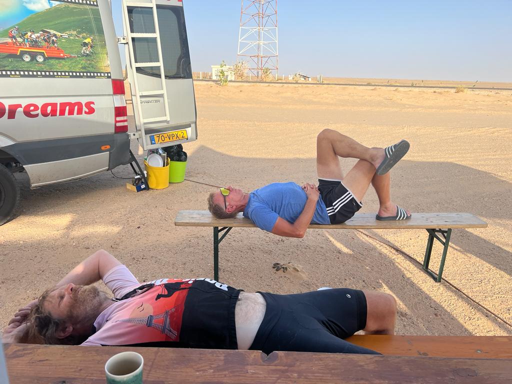 We made it to lunch at 90 km somehow, I didn’t think I could still pull off another 80 given the extreme crappiness of the road, and the strong side wind. But after eating a bit and drinking a ton, I felt better. The road also curved in the right direction after 20 more km. Some people were bailing to the trucks and the ones who were planning to ride to camp from lunch bailed too. But pretty soon, it was back in the saddle and onto the ‘Pain Train’, as Kris calls riding with Wytze.