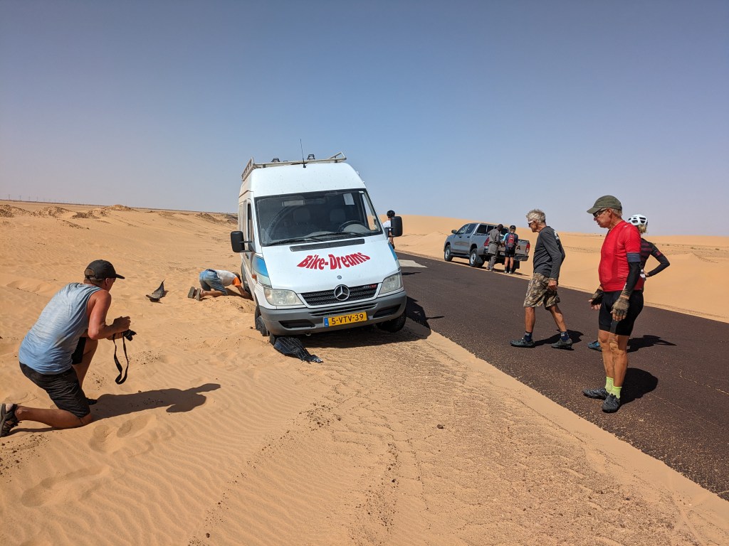 Wilbert had agreed to stop at 140 km for water so we were counting on that. But at more like 120 we ran into him, stuck in the sand. We tried to push him out but in the end asked a kind driver in a 4×4 pickup to pull him out. We refilled with water and cruised off.