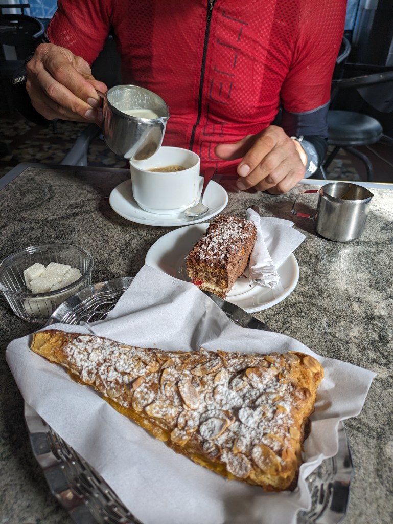 We had already picked out a restaurant. It was somehow a huge relief to sit down and relax after the border experience. The place was called Chez Dasso and advertised Slow Food and Organic. We eventually ordered then asked if they had beer since it wasn’t on the menu. Of course! So we had our first strictly legal beer in almost six weeks. While waiting I had a video call with Katie outside. Lunch came, two different seafood dishes and one chicken. It was really enjoyable, then we headed over to a patisserie for dessert, very tasty.