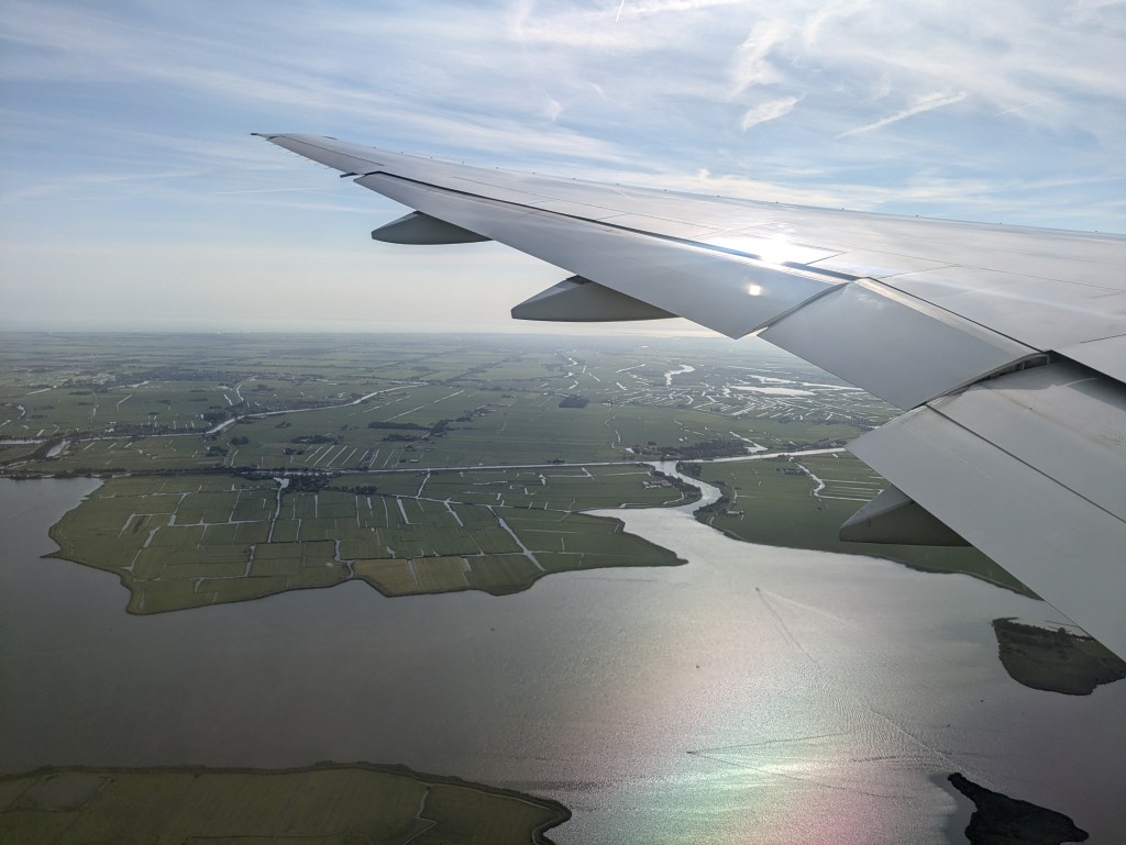 It was a non-stop flight, just under 10 hours, through the night, up and over Greenland and Iceland. I slept a couple of times, watched a couple of movies (Avengers End Game and First Man) and had three meals. As you approach Holland, you first see lots of windmills, way out to sea. Then finally the beach and then flat watery land with lots of canals.
