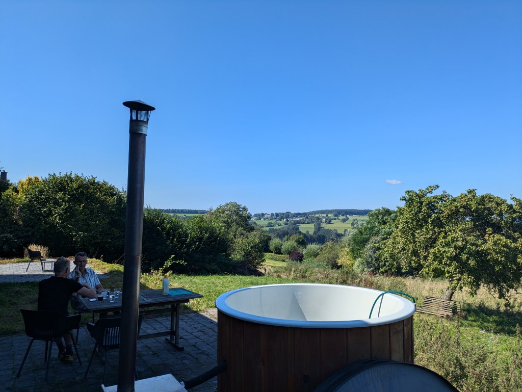 We had another 25 km to ride, up a couple of hills, through more WWII-famous towns, and made it back around 6 pm. The fire had burned all the wood so I restarted it but the hot tub was already about 40°C, perfect. After showers we enjoyed it, then sat in the evening sun sipping beers, reflecting on our lucky circumstances. It was a great first day of modest cycling.