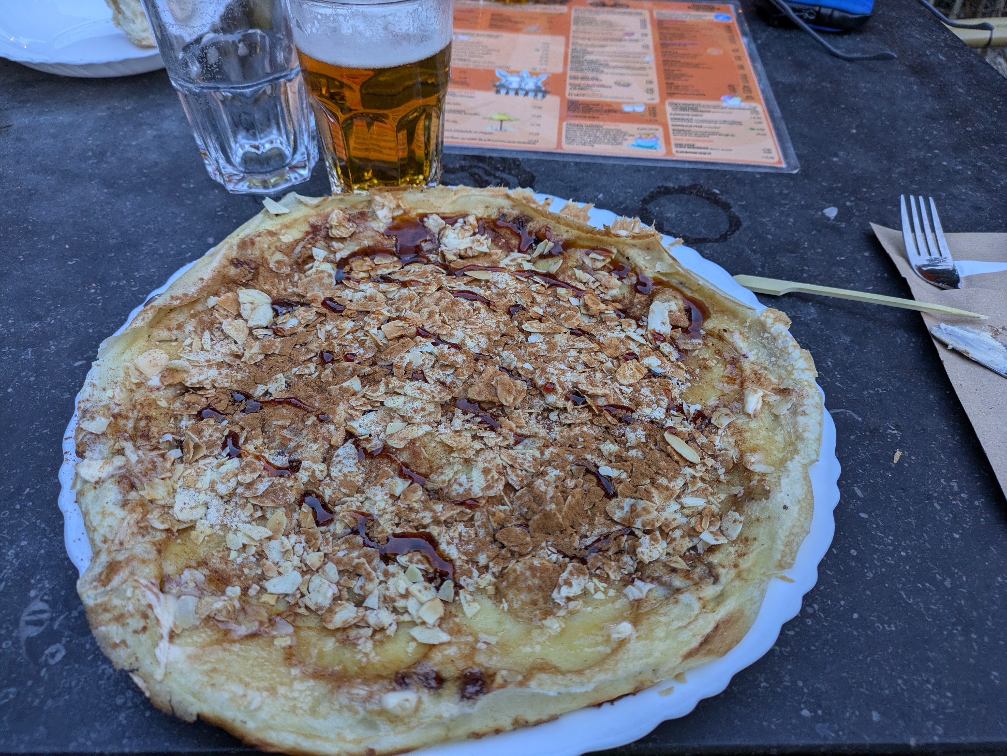 It was so un-American there it was amazing. There is a small parking lot for cars with a few but the bike parking! Row after row after row. We arrived late so had to go park in the 25th row or something. So many bikes. It was crowded and lively and at least they got beers and snacks for us quickly. We were warned that the pancakes would take an hour and I think that was about right. Mine was “Super Sem”, apples, tons of roasted shaved almonds, with hazel nuts. Powdered sugar on top, then add syrup. It was pretty big but looked thin so didn’t seem like a giant dinner but it was – I could barely eat one serving! Just delicious.