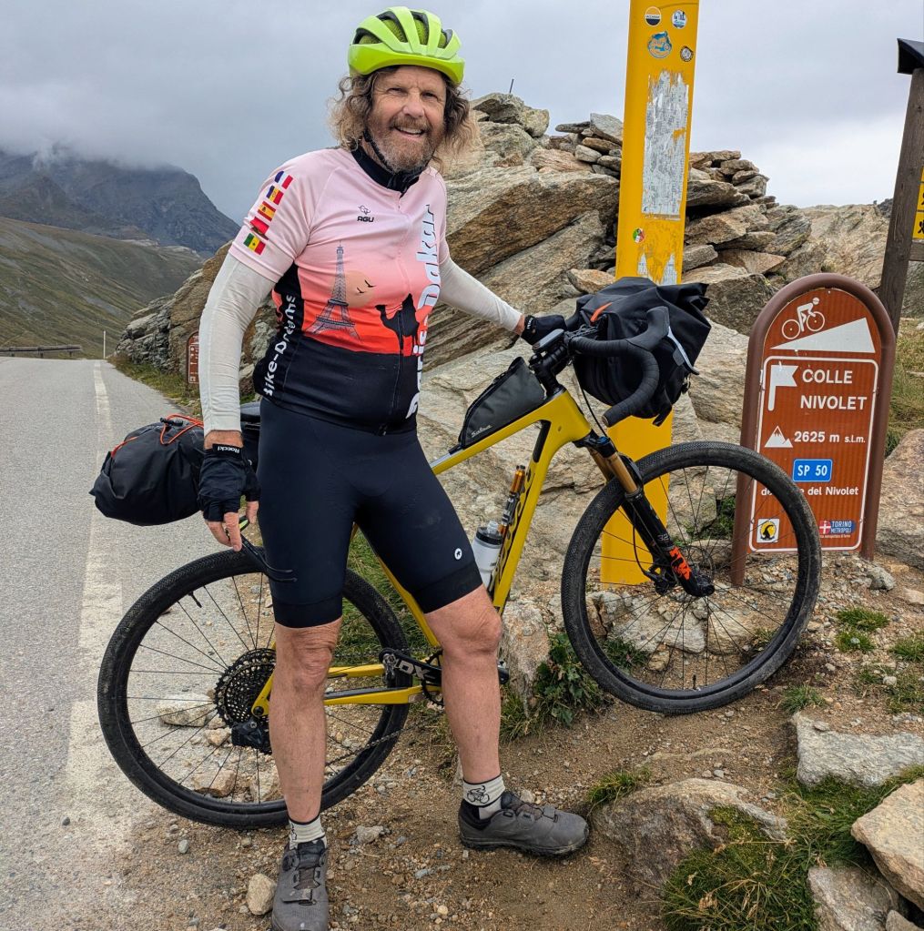 We rode by a lake, two refugios, saw lots of hikers, and then had a final climb up to the Colle de Nivolet, 2,625m, the highpoint of our whole trip. It was 3:00 and we had done one third of our distance for the day in about six and a half hours.