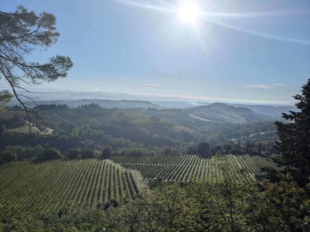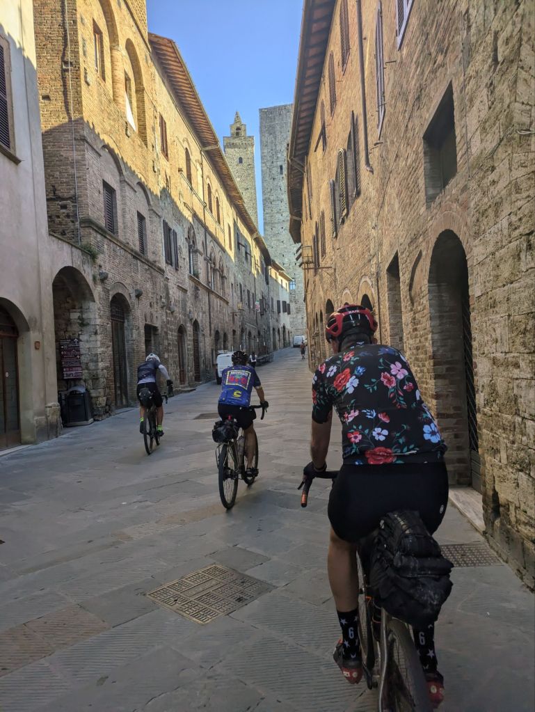 We woke up in our luxurious apartment, ate all our food, and took off at 8:30. We rode up to San Gimignano and accidentally did a scenic loop before finding the right track and heading down. It is nice that in Tuscany towns are on hilltops so you (mostly) start each day riding downhill.