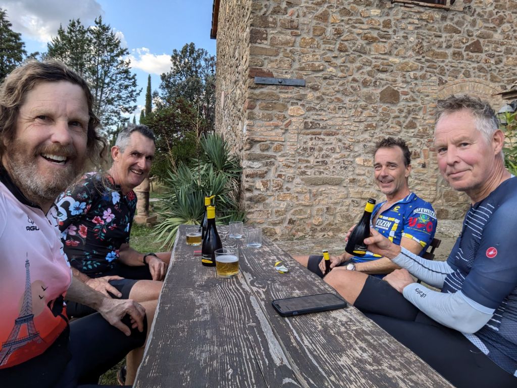 We checked in and before anything else, secured beers and snacks. We relaxed outside for over an hour. Then moved indoors to our rooms for showers. Soon it was dinner time. We had homemade wine (normal at an Agriturismo) with a great meal. It was about 2 ½ hours, very fun. Days like this aren’t easy but the sweaty hard work fades while the fun and comradery stays.