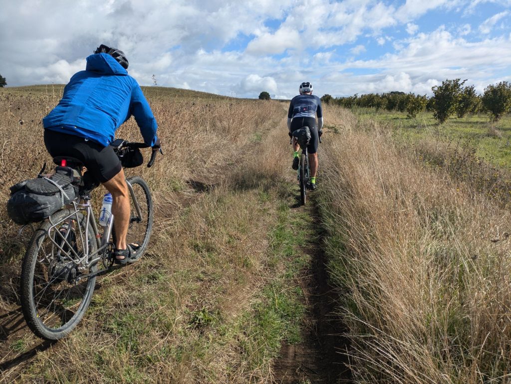 Soon after leaving town, we headed off on narrow dirt roads, deteriorating into farm tracks. There was a section we couldn’t get through, thick berry vines, so we detoured through a field. It seemed almost impossible but we hated the idea of retracing our path. So we walked/dragged our bikes through a field of old sunflower plants, and finally reconnected with our track.