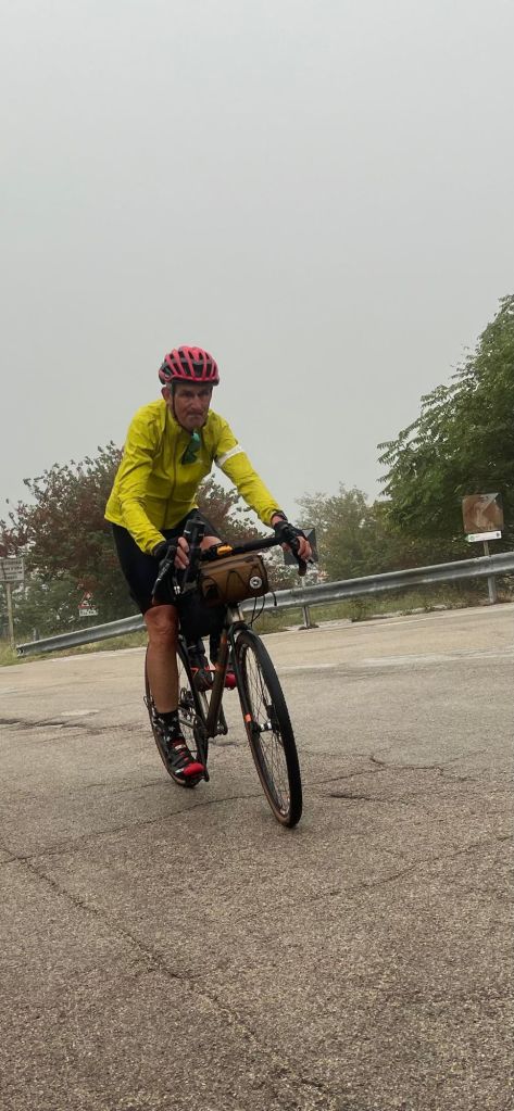 Our first goal was to get back onto the Italy Unite gravel track. The designers of the track would be proud of how we did it. Instead of taking the simple main road up, we added maybe 500m of climbing, got yelled at by toxic dump workers for going through their very closed gate, then up a gravel route that was so steep and rocky we had to push for a while. Then an 800m climb up a barely used mountain road into the cold clouds over 1,000m up. Finally, we descended 500m on a crappy rocky trail to a tiny town where we rejoined the Italy Unite route. The little bar there was so friendly and fun. Cookies and cappuccino made with Nutella for me.