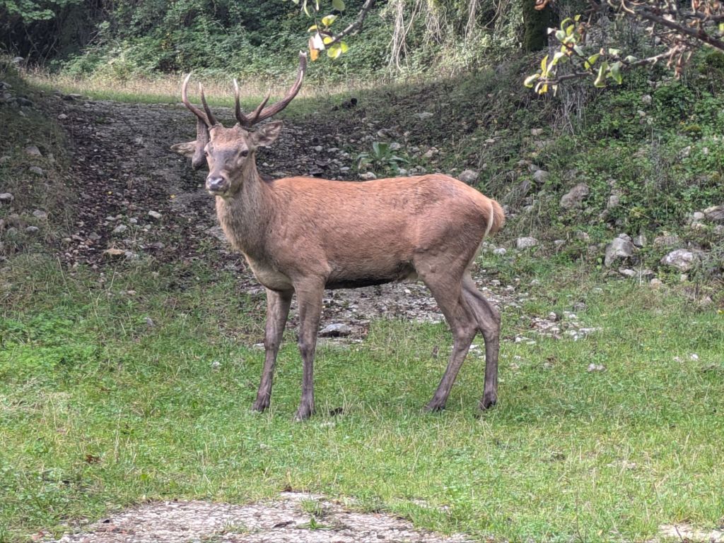 I slept really well with full color action packed dreams. We had fruit and yogurt then took off before 8:30. We had to descend to the lake, then around it on a gravel trail and we saw a few deer.
