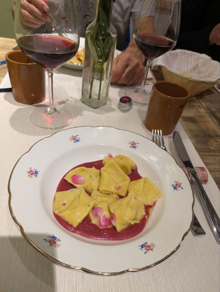 Pretty soon we went out for dinner. The good restaurant was just across the street but not open until 8. So we had beers at a bar then back to the restaurant. It was a stupendous dinner, 2 and a half hours, just great. The pasta with gorgonzola and nuts and creamed beets was incredible. We had a couple of bottles of an amazing Italian wine. Dessert was out of this world – the tiramisu set a new world standard and the pumpkin pie was awesome. Then a very herbal Amaro to cap it off. What a life! I can barely believe it’s real. Good night!