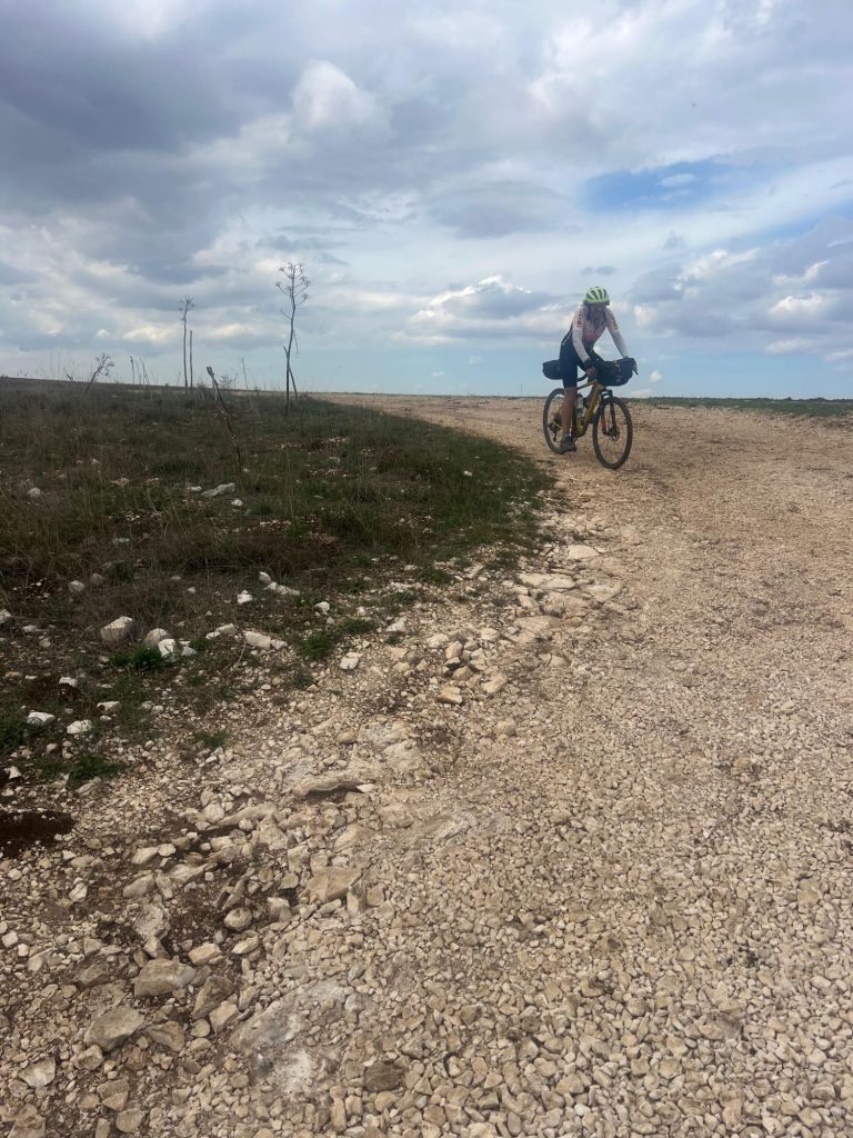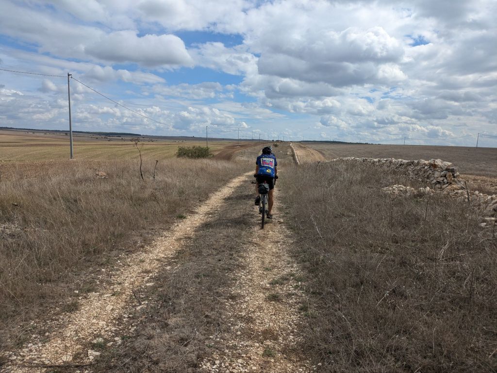 Pretty soon the road turned to gravel and it was a great route. We went by a rock quarry, through orchards and generally saw almost no people, just an occasional farmer in a tractor. Eventually we made it to the one town on today’s route, Minervino Murge. It’s quite hilly. Andrew had a flat near the bottom. After he quickly fixed it, he and I climbed all through the town and met Wytze and Daniel at a café at the top. We had drinks, but then Wytze noticed the lack of a lunch town ahead. He walked away and returned with a box of 12 pastries which we inhaled with a second round of drinks.