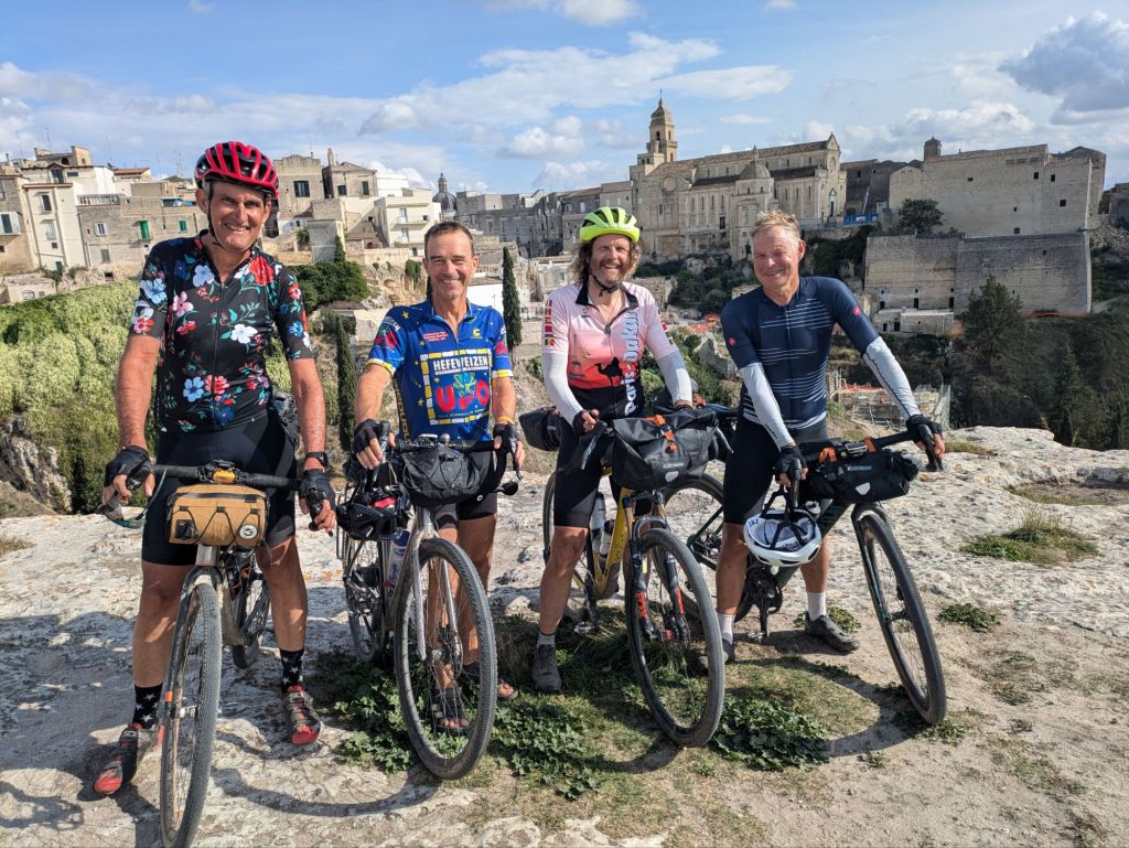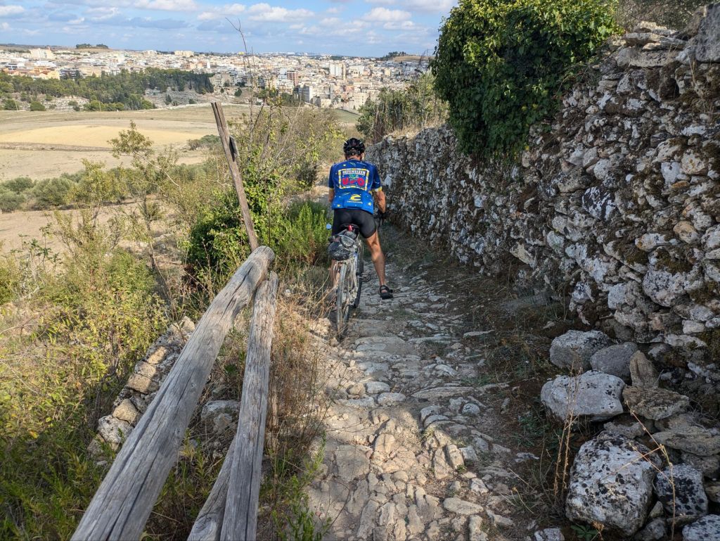We got almost to Gravina in Puglia when our track turned off and gave us a few more km of dirt, even some singletrack and a rocky long staircase to descend carefully. I was not prepared for the amazing sight on arrival. We were across a chasm from the Cathedral and the old town. A few tourists were walking around and we could see the famous Roman Bridge which looked like the only way we could get across to town. A nice German lady took our photos and mentioned that the Roman Bridge was a “No Time To Die” (2021 James Bond film) shooting site.