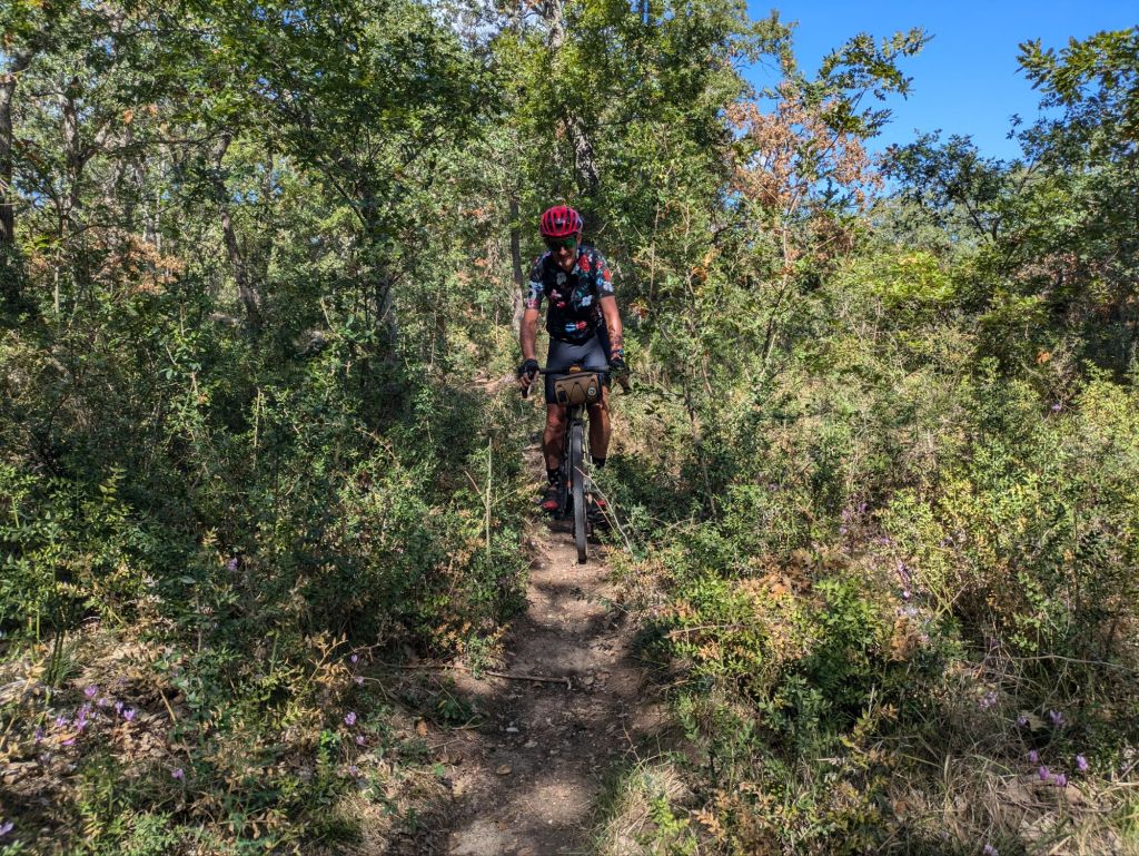 It felt later but we carried down the stairs and started riding at 10. The gravel path was confusing and not possible to follow so we improvised to get out of town. We rode a dirt road to reconnect and it turned out that most of our ride today was off-road. We had some steep climbs and descents, beautiful single-track through the forest and a little bit of paved road connecting the trails.