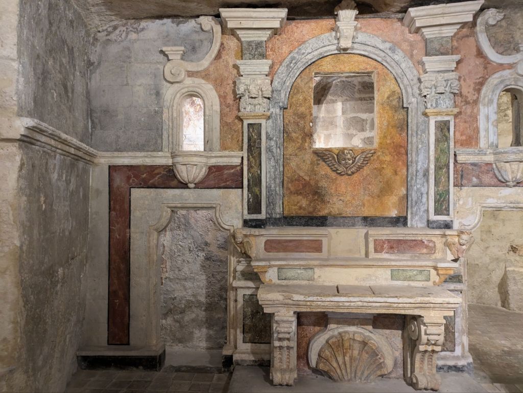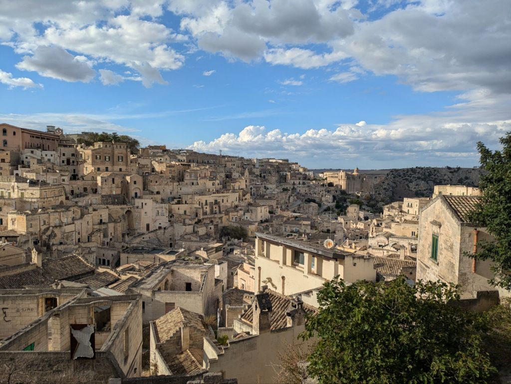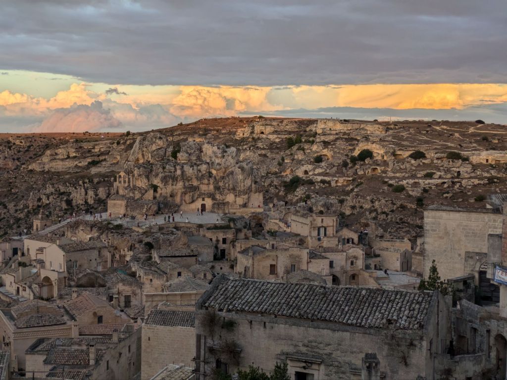 A local named Cosimo showed us around with a couple of other people for two hours. He was born here and told us a lot about the history. Interestingly Matera was called the “Shame of Italy” until 1952 when the caves were finally declared unfit for people to live in and the residents forced into nearby alternative housing. Later, remodeling happened such that today it’s vibrant and instead of saying they are from somewhere else, residents proudly say they are from Matera. He took us into a cave museum showing how people were living until the 1950’s and into a cave church. People have been living here continuously for 9,000 years! He also showed us another place where “No Time To Die” was shot and told us about how it was the two months they were shooting here in 2019. We saw a “Passion of the Christ” shooting spot too.