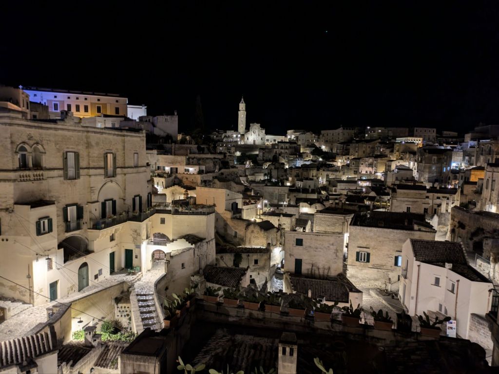 Matera is a musical town with a big conservatory. We heard students practicing a few times on our walk. An orchestra was just finishing practice by our restaurant and we stopped to listen to more live music at an outdoor restaurant after 10 pm on the way home. We probably haven’t done it justice but I loved our short visit to Matera.