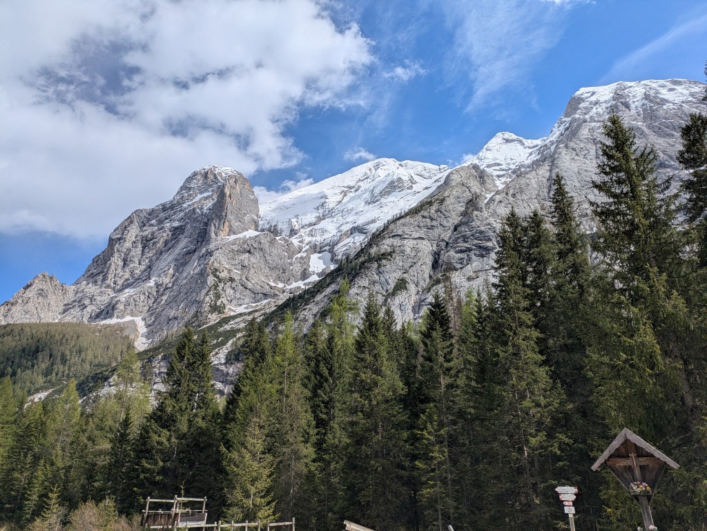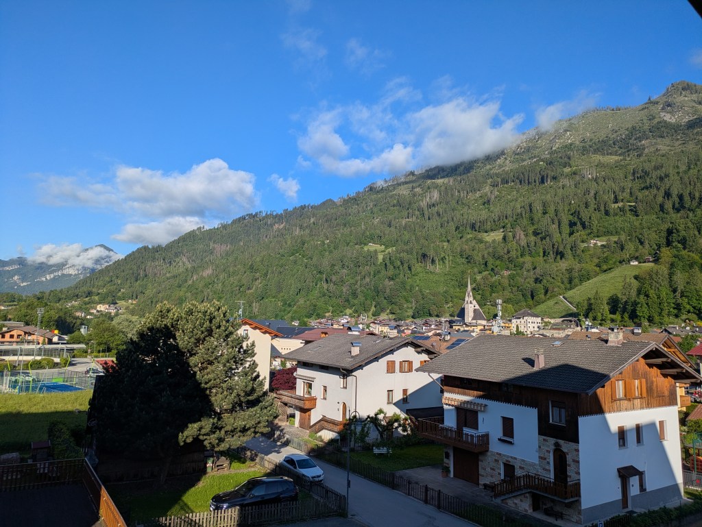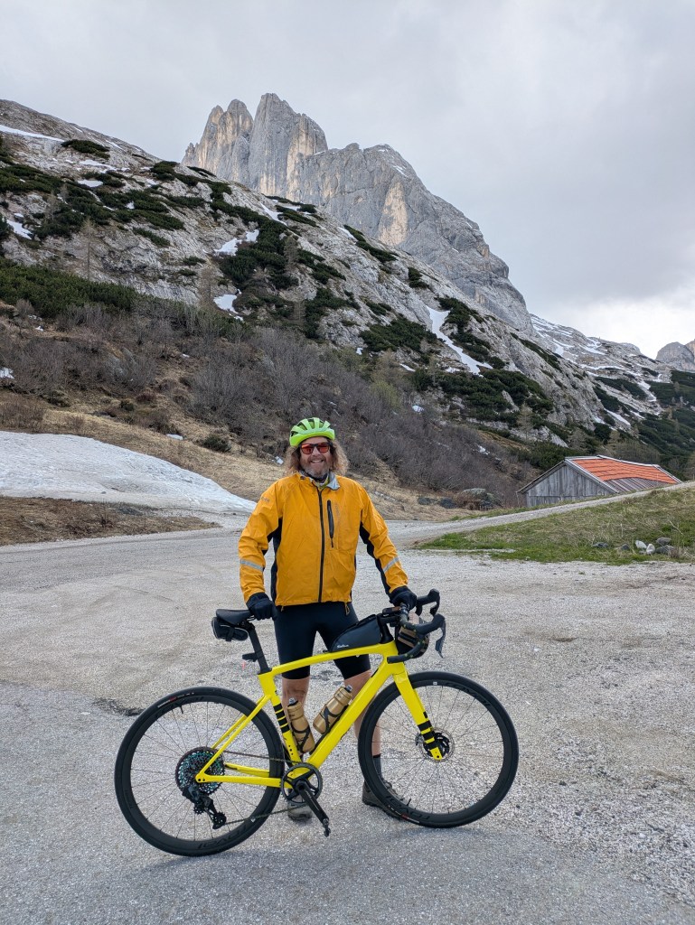 This was truly a day of fun cycling in the Dolomites! It had everything. Each of our passes today has been featured in the Giro d’Italia many times. We left at the usual time, 8:15. Our first climb, Passo Rolle, started pretty much right away. I guess I was feeling a lot better than yesterday and it had less climbing and distance than Cima Grappa yesterday. Anyway, it was fine cruising up – it took me over two hours for the 1,250m but who’s counting? I had a banana on top then a high speed 8 minute descent to a junction where we turned up our second climb, Passo Valles. This one was shorter but kicked at the end (steep). This was our first time over 2,000m and a really nice, longer, descent took us to lunch down in the lowlands, 1,200m below.