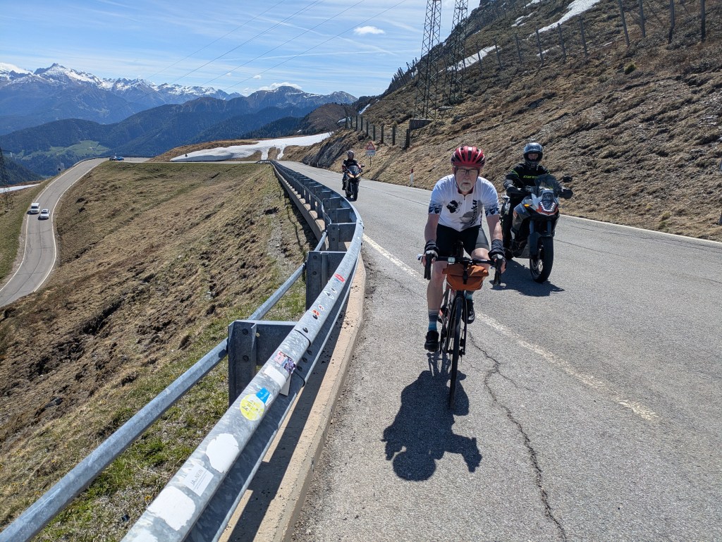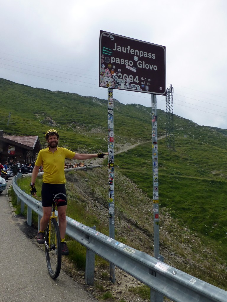 After a good night, with little or no coughing, my throat and lungs felt better so I had high hopes of riding all the way to the little town of Stelvio. We got started as usual at 8:20 and the big climb to Passo di Monte Giovo started almost right away. It was interesting for me since I had unicycled this pass in the reverse direction in 2012. This time I felt weak but just kept turning the pedals. I stopped at a gorgeous viewpoint after I’d climbed 1,000m, and the summit was in sight from there. There was lots of traffic, motorcycles, cars and trucks, in both directions which was a little annoying but I don’t think anyone had any close calls. It took me close to two hours for the 14 km climb; I just had no power. But once on top, our whole crew was there and we took some photos and just to be done climbing felt so good.