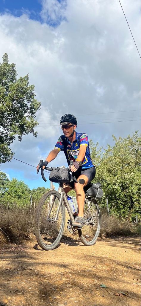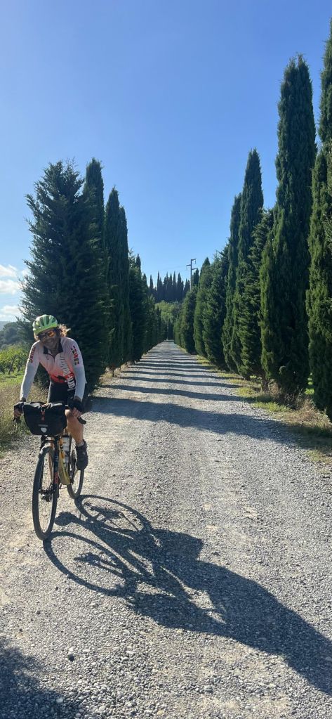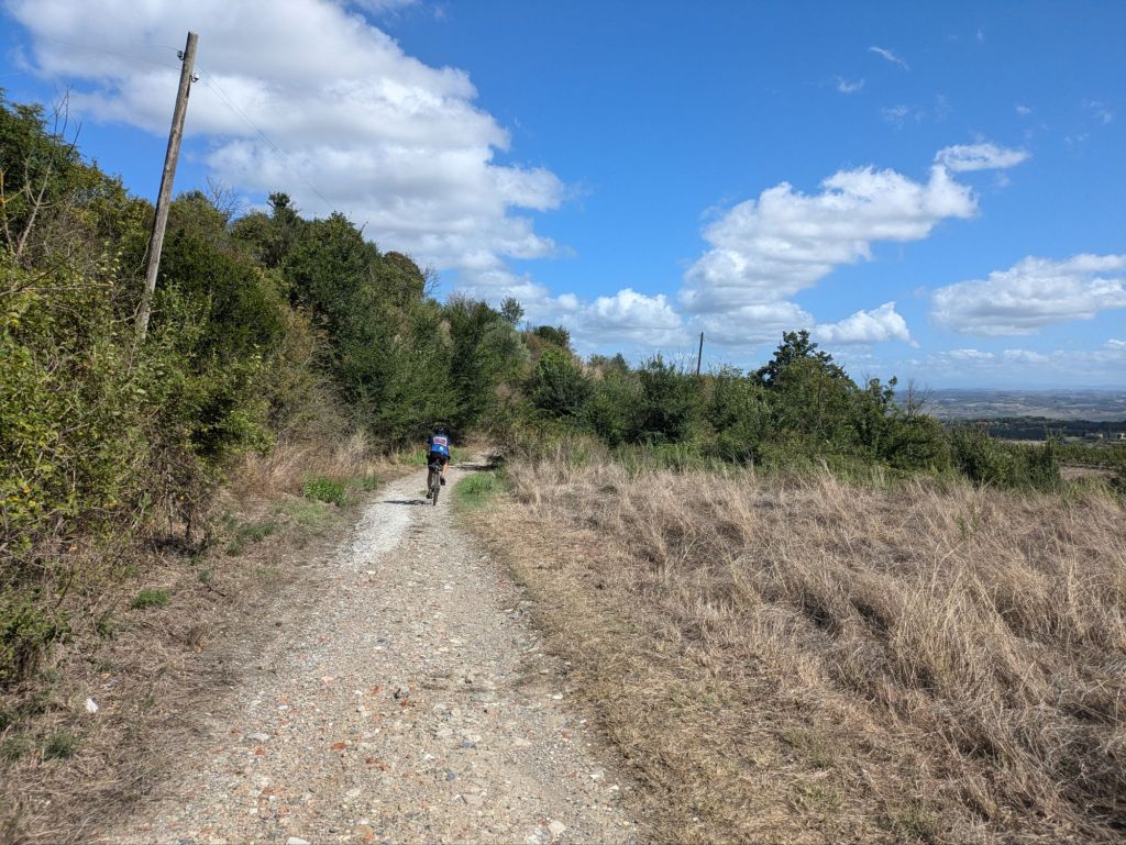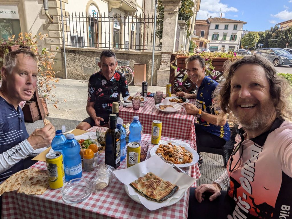 To meet up with Bike Dreams we had to have a slow start so looked around Semproniano in the morning, leaving at 10:30. At the planned place, 10 km along, Ype had just arrived in his lunch van. We had a nice reunion with him, then quickly the fastest riders arrived, guys doing the paved option. A bit later dirtier riders showed up, all happy. We ended up staying for a few hours; it was amazing to see so many people I knew from previous tours, over a dozen. Right after we said goodbye and took off, we met Greg bringing up the rear – I had last seen him five years ago in South America. Cheers to every one of you riding Bike Dreams Strada Italia!