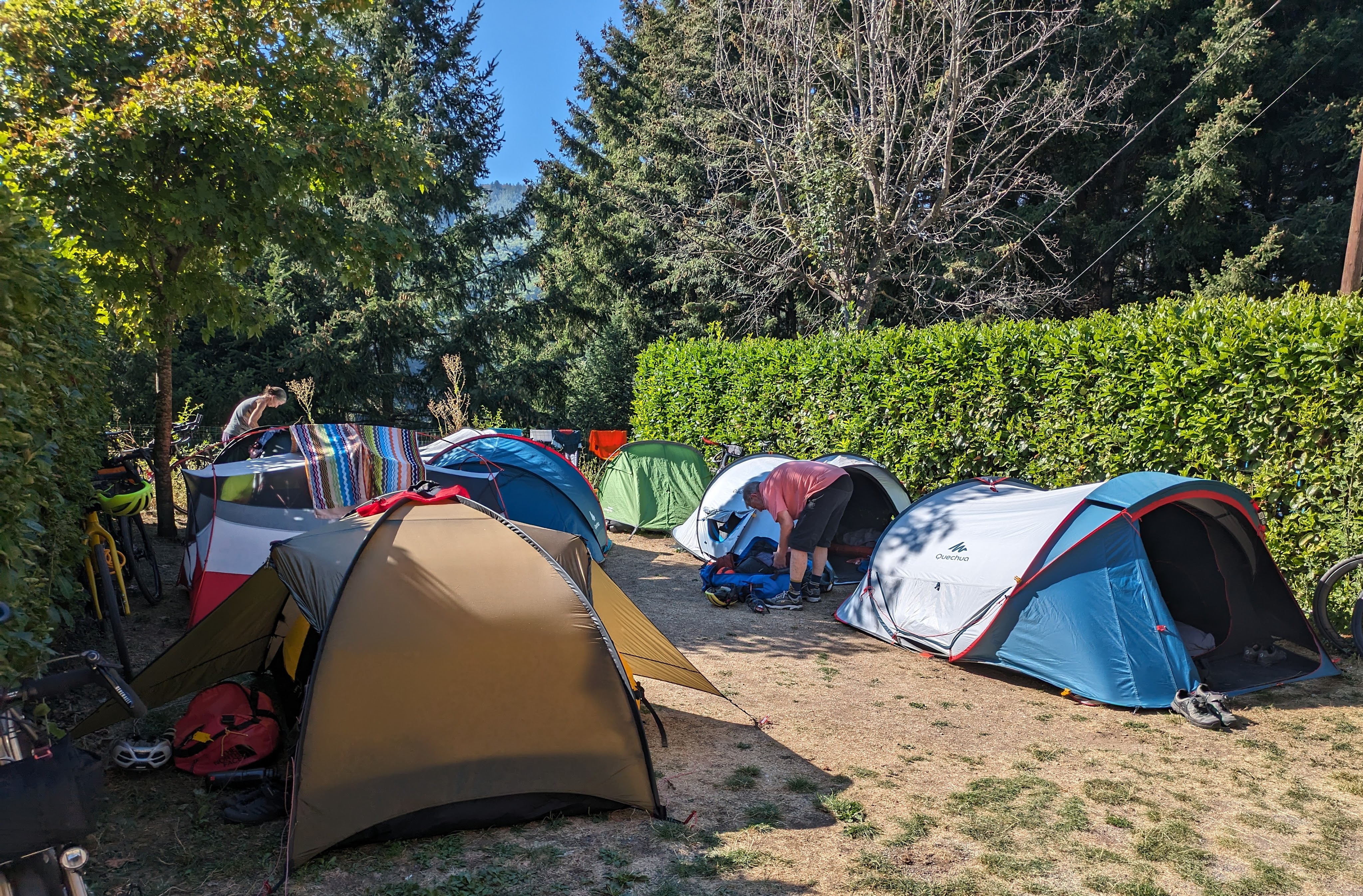 It was something like 30 km and we did it non-stop, blasting through the little towns, like Canillo where I unicycled for four days in 2016. Taking the roundabouts at high speed was really fun. Pretty quickly we arrived at the campsite where the trucks had just arrived. So we did baggage unloading duty, then tent unloading duty, then set up tents. They were still wet from last night so it was good to get set up early, or so we thought.
